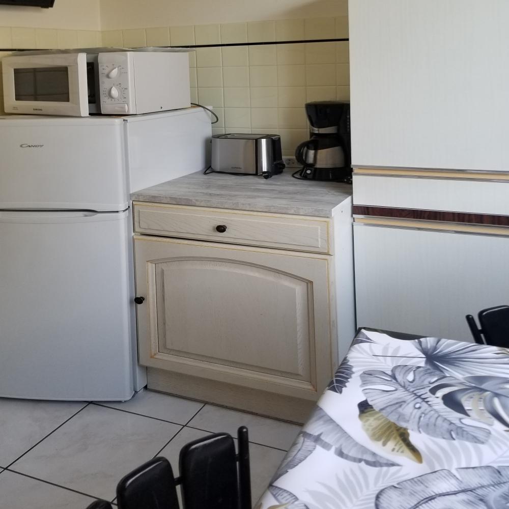 Une cuisine équipée avec cuisinière vitro-céramique, un four micro-ondes, un lave-vaisselle, un réfrigérateur\congélateur, une seconde petite TV.....